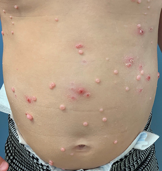 Een 3 jaar oud meisje heeft sinds enkele maanden uitbreidende bultjes die jeuken en soms gaan ontsteken. Zij heeft eerder eczeem gehad. Er zijn geen andere familieleden met dezelfde huidafwijkingen.
