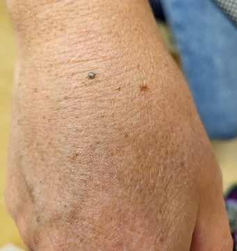 Een 55-jarige patiënte meldt zich met een ‘gek plekje’ op de handrug dat er al jaren zit en af en toe jeukt. Ze vraagt zich af of het plekje kwaad kan. Ze heeft nooit eerder dergelijke plekjes gehad en er is geen sprake van overmatige blootstelling aan de zon of zonverbranding in het verleden. In de familie komen geen vergelijkbare huidafwijkingen voor. Bij onderzoek ziet de huisarts een donkerblauwe macula van ongeveer 2 mm doorsnede, met een regelmatige begrenzing en centraal enige verbleking. De huisarts verricht dermatoscopie, maar twijfelt over de diagnose. Ze stuurt een macroscopische en dermatoscopische foto naar de dermatoloog voor teleconsultatie. Wat is je diagnose?