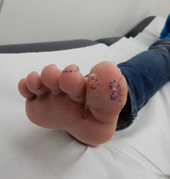 Verspreid over de tenen en vingers zagen we lenticulaire tot nummulaire huidkleurige vlakke papels en plaques. De grootste plaque die de meeste klachten gaf zat aan de grote teen van de rechtervoet (mediale zijde). Wat is uw diagnose?