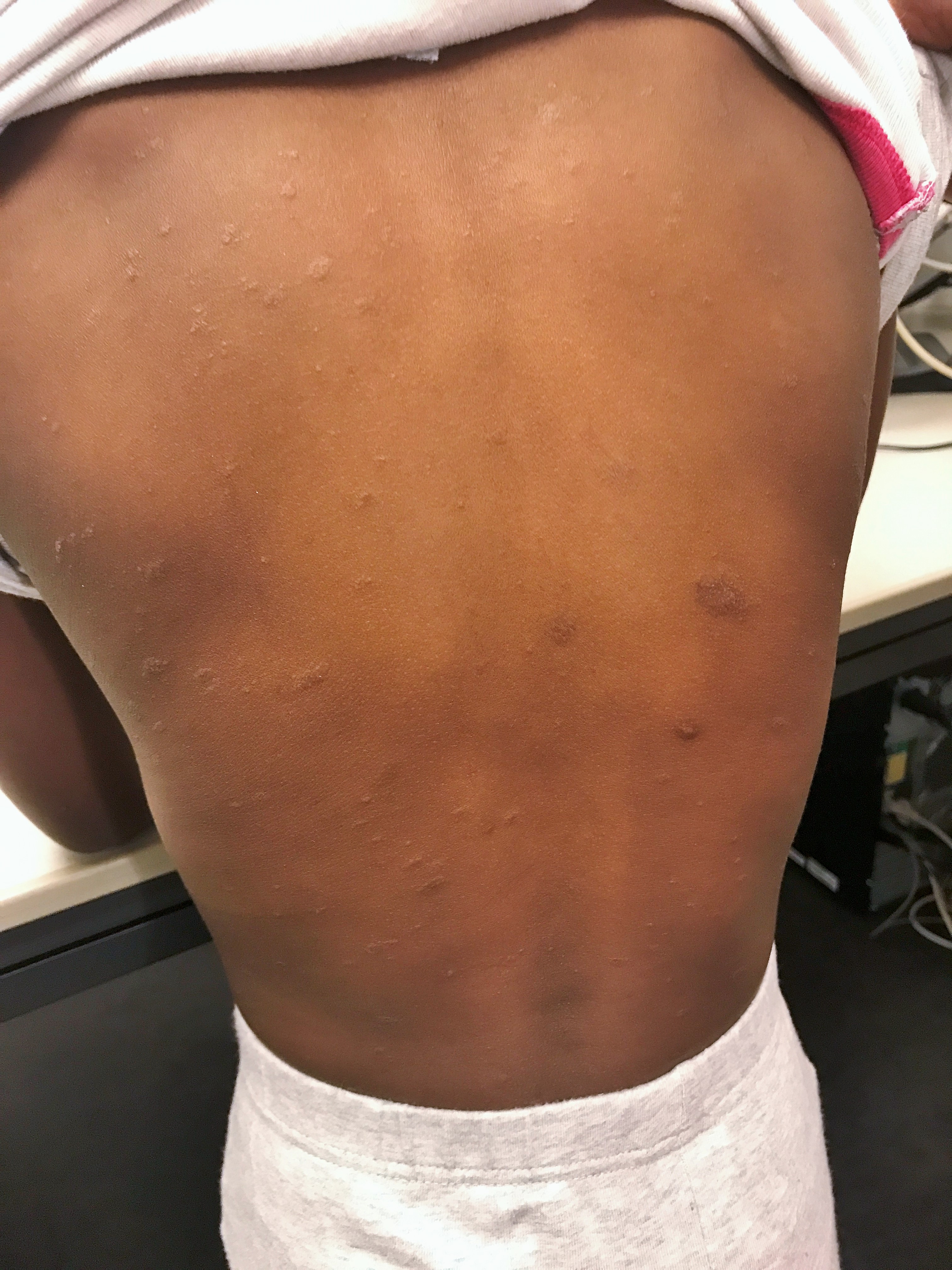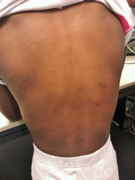 Meisje van 8 jaar oud met sinds enkele dagen heftig jeukende uitslag op de rug, borst en de buik. Zij woont sinds enkele jaren in Nederland komt oorspronkelijk uit centraal Afrika. Is er niet ziek van en klaagt alleen over jeuk.