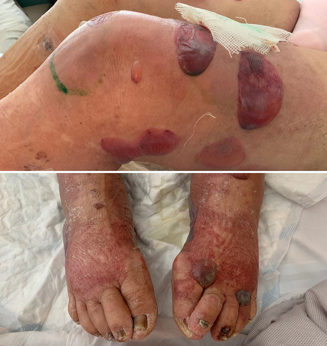 Een 84-jarige vrouw heeft last van oedeem van haar benen, met sinds twee weken jeuk en blaren die zich uitbreiden naar haar armen en rug. Er zijn geen slijmvliesafwijkingen. Ze heeft geen koorts of klachten over malaise. De voorgeschiedenis vermeldt atriumfibrilleren, hypertensie en nierinsufficiëntie. Haar medicatie: acenocoumarol, amiodoron, furosemide, barnidipine, simvastatine en olmersatan. Twee dagen geleden werd flucloxacilline gestart.