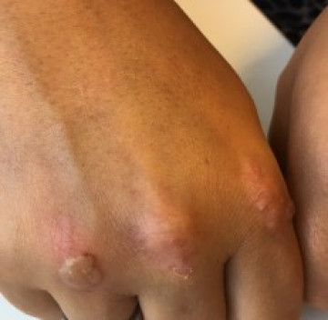 7. Hand van een 5-jarig meisje met hevig jeukende papeltjes.