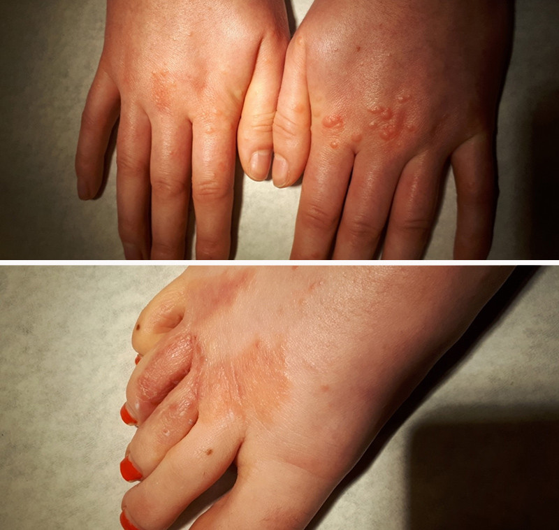 Een jonge vrouw komt langs met jeukende bultjes op de handen. Ze had enkele weken geleden last van een jeukende huidafwijking tussen de tenen van de rechtervoet en startte met miconazolcrème. Na een paar dagen verschenen de bultjes op de handen. Wat is uw diagnose?