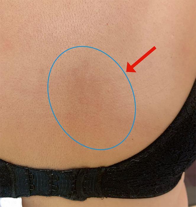 Een 51-jarige vrouw komt op het spreekuur in verband met een jeukende, niet pijnlijke huidafwijking bij de onderzijde van het rechterschouderblad sinds circa een halfjaar. In de zomer was het minder opvallend doordat de omliggende huid donkerder was. Ze wil graag van de jeuk af. De medische voorgeschiedenis vermeldt migraine waarvoor sumatriptan zo nodig. De patiënte rookt niet en is niet bekend met allergieën.