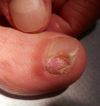 Een 40-jarige man komt op het spreekuur in verband met een knobbel die is ontstaan in de nagel van zijn grote teen. Hij is eerder behandeld wegens onychomycose aan dezelfde teen met een kuur itraconazol. Hij heeft geen last van de teen of de knobbel. De huisarts ziet een gladde, ovaalvormige tumor die de teennagel van straal 1 splijt.