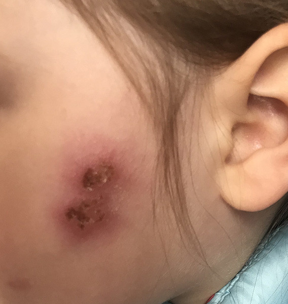 Vader komt met zijn 2-jarige dochter op het spreekuur. De huisarts ziet twee crusteuze laesies in het gelaat. Vader vertelt dat de plekken er enkele dagen zitten en dat de roodheid uitbreidt. De plekken lijken pijnlijk maar jeuken niet.