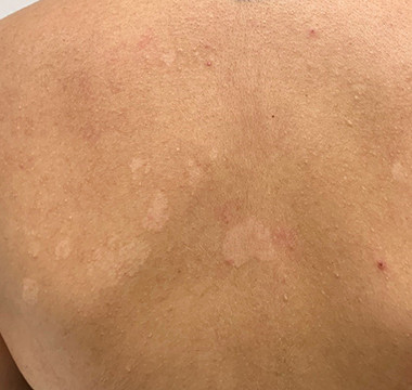 Een 23-jarige vrouw heeft sinds enkele maanden lichte vlekken op haar rug. Ze heeft er geen last van, maar vindt het lelijk. De algemene voorgeschiedenis vermeldt behalve een vitamine D-tekort geen huidziekten, atopie of auto-imuunziekten. Voorafgaand aan de verkleuringen op de rug waren er geen andere huidafwijkingen.