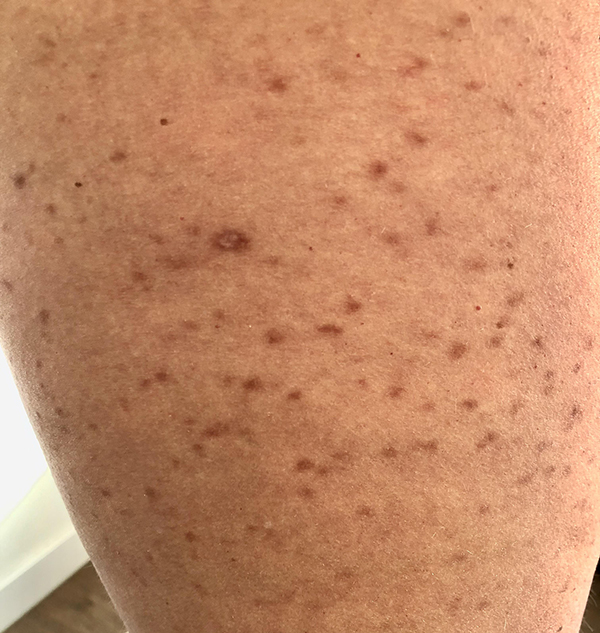 Bij inspectie ziet de huisarts voornamelijk op de bovenbenen multipele roodbruine maculae (figuur) en nog enkele soortgelijke huidafwijkingen op de rug. De huisarts heeft niet direct een diagnose paraat. In overleg met de patiënt neemt hij een biopt voor nadere diagnostiek.