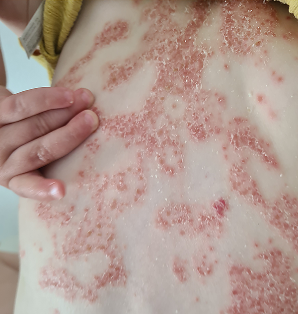 Na 2 weken is er duidelijke verbetering: minder erytheem en jeuk. Maar 7 dagen na de laatste controle komen de ouders opnieuw naar de poli met hun zoontje. Op de plekken van het eerdere eczeem zijn plotseling zeer pijnlijke laesies ontstaan, die zich snel hebben uitgebreid over het lichaam (figuur). Het kind voelt zich niet lekker en heeft lichte verhoging. Er zijn geen koortslipklachten in de familie of directe omgeving.