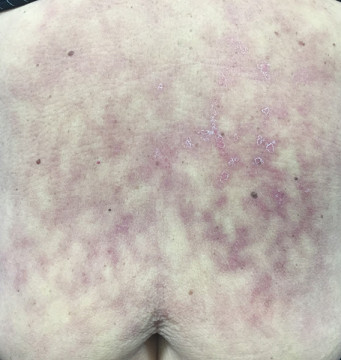 Een 50-jarige vrouw komt in verband met reticulaire (netvormige) verkleuringen op de buik op het spreekuur. De verkleuringen zorgen niet voor klachten. Ze is bekend met een chronische pancreatitis en bij navraag blijkt ze sinds maanden een kruik te gebruiken om haar pijnklachten te verminderen.