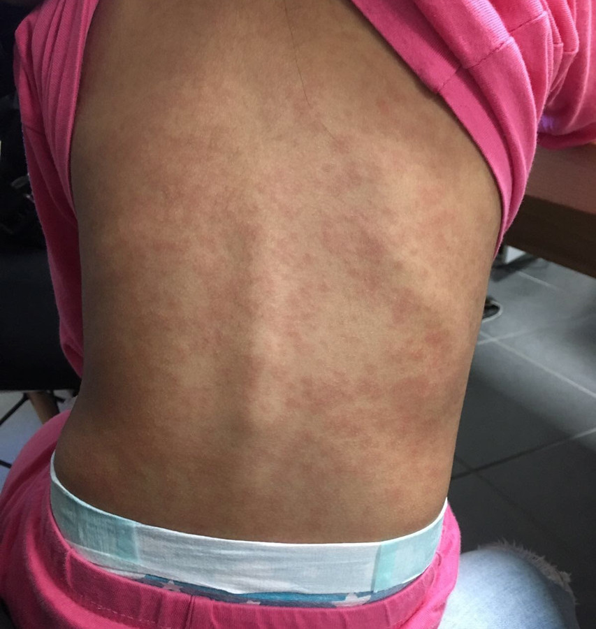Een 10-jarig meisje komt op het spreekuur en is sinds vijf dagen behoorlijk ziek met hoge koorts (39,5 ºC). Ze heeft rode, niet-jeukende uitslag die in het gezicht begonnen is en zich heeft uitgebreid over de romp. Het betreft maculopapuleuze confluerende vlekken. Verder klaagt ze over een pijnlijke mond en rode tranende ogen.