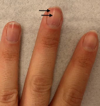 Een 37-jarige vrouw, die lichen sclerosis heeft, komt bij de huisarts met pijnlijke rode nagelranden. Aan alle vingernagels is distaal een scherpbegrensde, rode rand in het nagelbed te zien (zie pijl) en proximaal daarvan een bleek gedeelte (zie pijl). Rondom de nagels is de huid erythemateus en pijnlijk bij aanraking. Het gevoel en de doorbloeding zijn normaal.