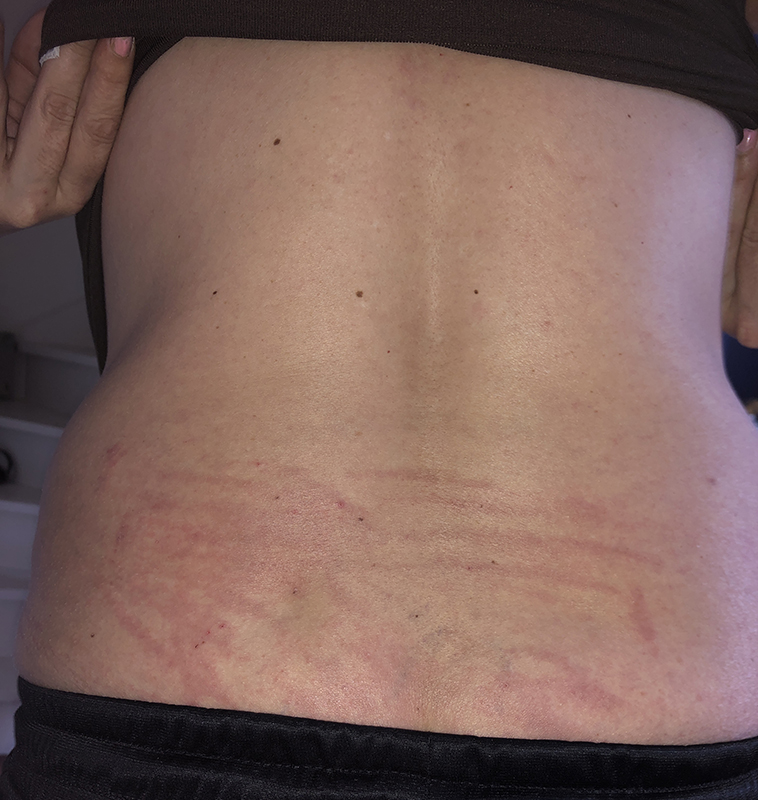 Een 46-jarige vrouw komt kort na de kerstdagen op het spreekuur met progressieve streepvormige rode huiduitslag op haar onderrug en billen. De uitslag jeukt, maar doet geen pijn. Ze had deze dagen in de tuin gewerkt. Bij het kerstdiner had ze gegourmet met veel groentes en paddenstoelen. De patiënte gebruikt geen medicatie en er zijn geen relevante diagnoses in haar voorgeschiedenis.