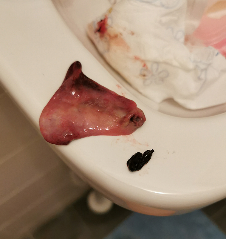 Een 31-jarige patiënte met een blanco voorgeschiedenis belt haar huisarts omdat ze wee-achtige krampen voelde in haar onderbuik. Daarna verloor ze via de vagina bloed en een ‘lapje vlees’. Ze denkt niet dat ze zwanger is (geweest). Als medicatie gebruikt ze citalopram en ethinylestradiol/drospirenon. Op verzoek brengt ze het weefsel naar de praktijk.