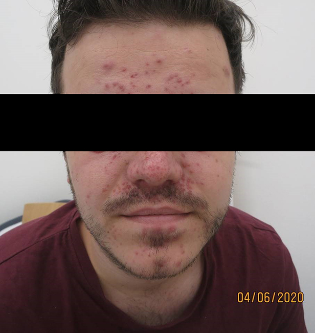 Een 26-jarige man met een blanco voorgeschiedenis krijgt van zijn huisarts een verwijzing naar de dermatoloog, omdat hij sinds een half jaar last heeft van huiduitslag in het gezicht. De plekken zijn plotseling ontstaan, zonder dat hij uitlokkende factoren heeft opgemerkt. Zijn huisarts dacht aanvankelijk aan rosacea en gaf hem metronidazolcrème. Die had geen effect. Met de gedachte dat het dan om acne vulgaris moest gaan, schreef de huisarts vervolgens doxycycline (oraal) voor, wat de patiënt nog steeds gebruikt. Dit lijkt wel wat te helpen. De patiënt heeft geen andere klachten. De huid van romp en ledematen is niet aangedaan.