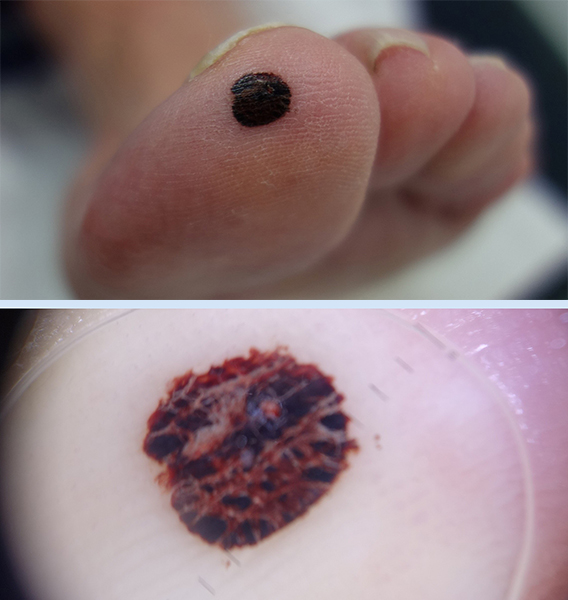 Een 88-jarige man heeft een zwarte verkleuring op zijn teen ontdekt. Hij heeft hier geen last van. Er is geen voorafgaand trauma. De voorgeschiedenis vermeldt onder andere multipele basaalcelcarcinomen.