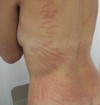 Een 36-jarige vrouw, bekend met de ziekte van Graves, bezoekt de huisartsenpost omdat zij sinds 3 dagen een brandende, jeukende huiduitslag heeft op romp en extremiteiten die toeneemt. Patiënte is bekend met een schelp- en schaaldierenallergie, maar heeft deze producten recentelijk niet gegeten. Wel heeft zij de dag voor het ontstaan van de zweepslagvormige huiduitslag een pastasaus gegeten met volgens echtgenoot ‘lekker kort’ gebakken Shiitakes (eetbare paddenstoel). Patiënte is niet bekend met eczeem en heeft recent niet in de tuin gewerkt. Er is geen sprake van benauwdheid of zwelling van tong of keel. Zij geeft aan dat zij de week daarvoor wel codeïne en noscapine heeft gebruikt in verband met een kriebelhoest.